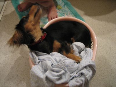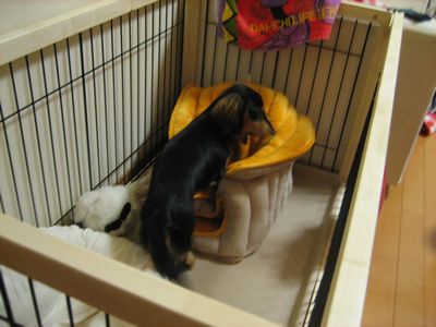 固い床より柔らかい服の上が良かったのか、お姉ちゃんのにおいがする服の上が良かったのか・・・