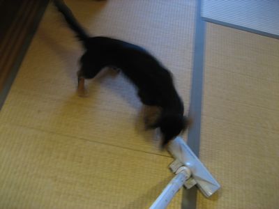 自分の体くらいある大きくてウィーンと音を立てる宿敵(笑)に吼えて威嚇します。